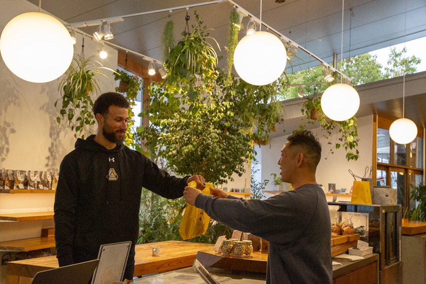 トレイ 2023年までクレインサンダースで一緒にプレイしたアキ・チェンバース選手の奥さんが、ここのガーリックトーストがおいしいって教えてくれたのが最初のきっかけです。それから他のパンも色々と食べるようになりました。自宅に帰る道中にお店があるので寄りやすいし、ランチ用に家族のパンを買って帰るというのがルーティーンになってます。
